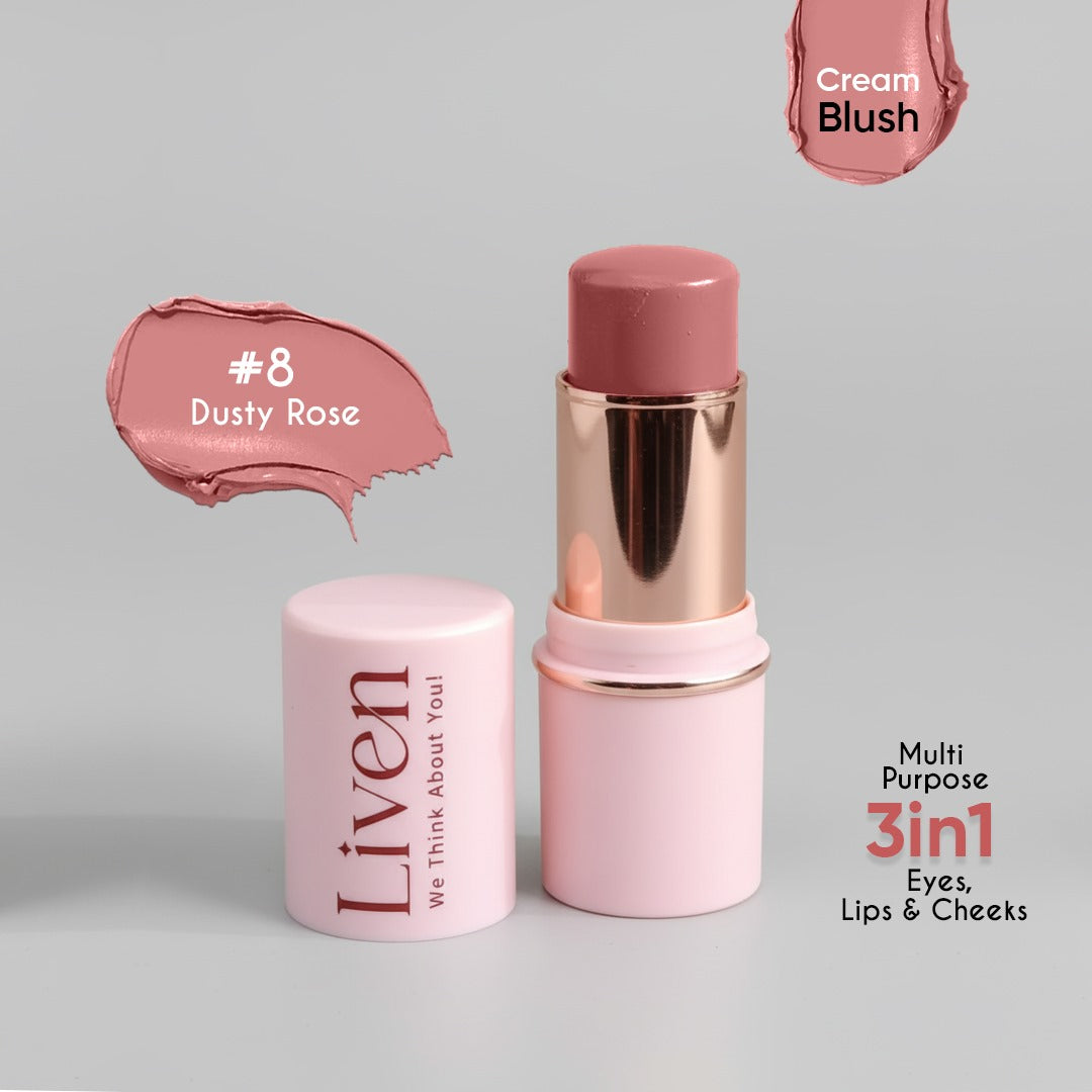 Achieve a naturally radiant flush with our Liven Cream Blush Stick in #8 Dusty Rose. This versatile cream blush stick delivers a buildable, hydrating color that blends seamlessly onto cheeks and lips. The warm, sophisticated Dusty Rose shade is perfect for adding a touch of subtle contour or a soft, natural tint.